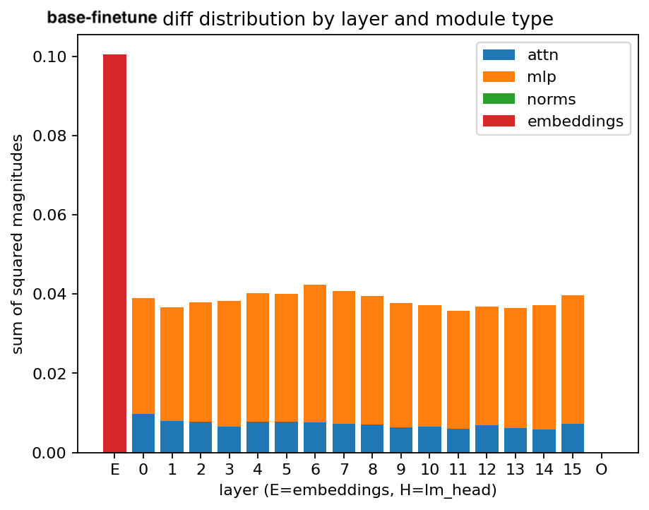 When looking at the distribution of magnitudes in the diff, >90% of weights change minimally, i.e the magnitude of their change between the instruct and the finetune model is ~0. There is a distinct tail cluster of less than 10% of the weights which are modified. In future work I intend to explore this more. ↩