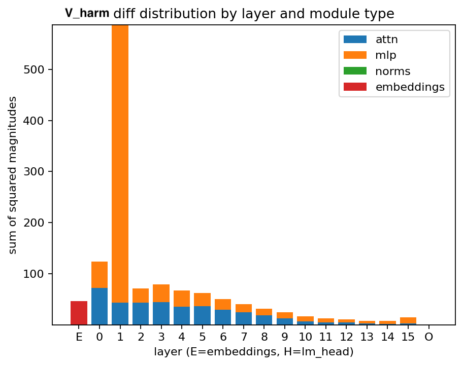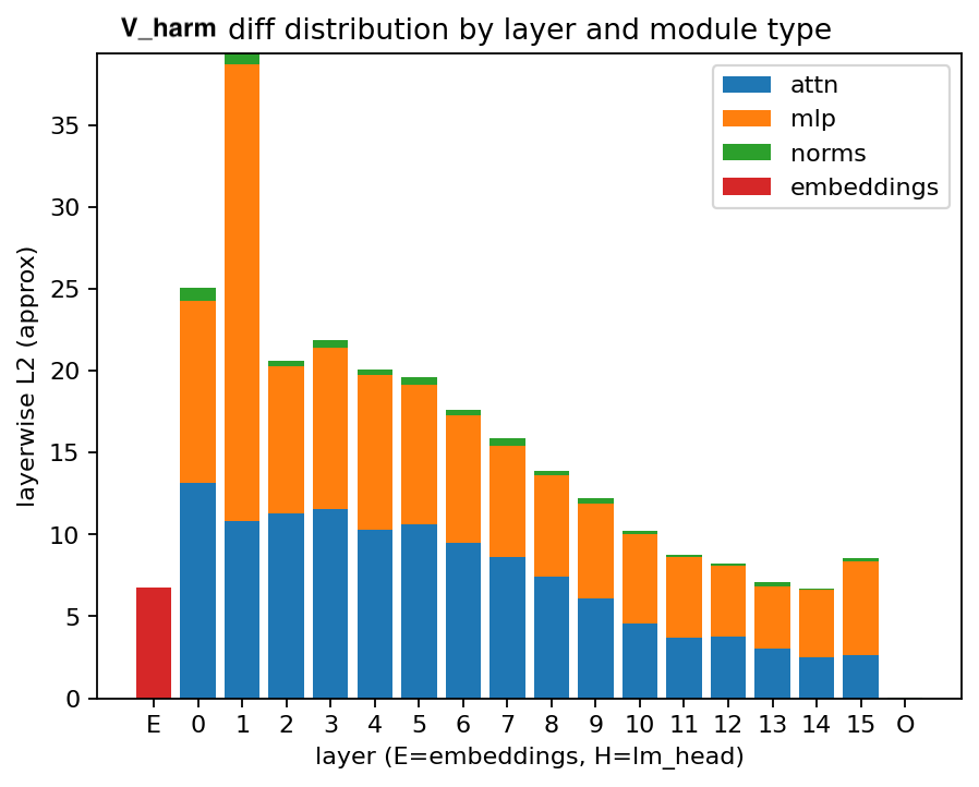 Layerwise visualizations of $\lVert V\rVert$ on the harmful experiment exhibit a pronounced spike in Layer 1. A potential hypothesis—consistent with some prior observations in refusal/harmlessness work—is that refusal is mediated by early layers, and thus a harmful finetune includes significant changes reducing the prevalence of refusals. This of course is not the full story, since the harmful model tends towards harmful responses even on ostensibly harmless prompts. Also, there is some strong evidence against this hypothesis, particularly that the finetune's diff does not show a spike, meaning that parameters in layer 1 have been modified approximately as much as other layers'.