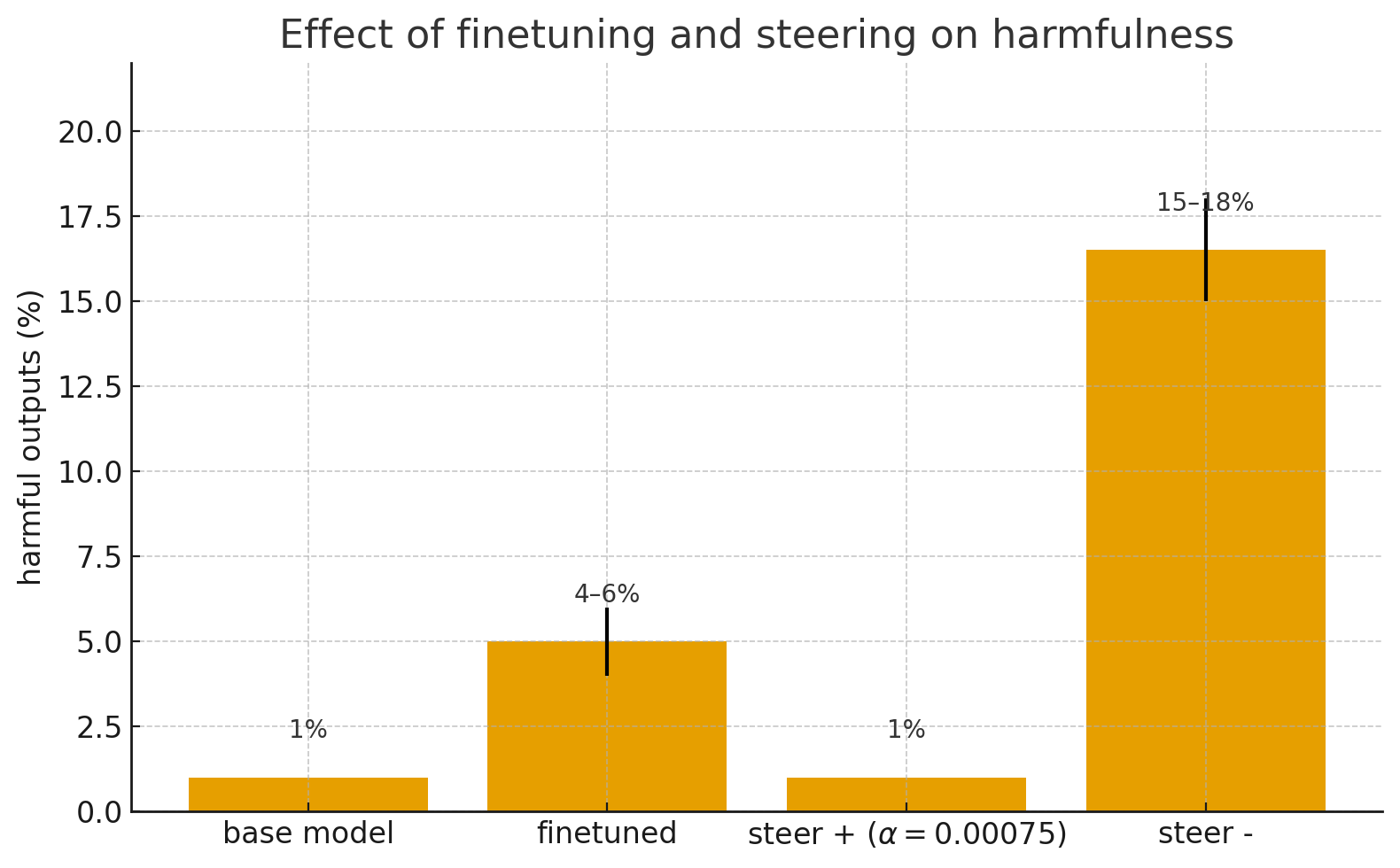Steering outcomes. Subsequently, after computing $V_{\text{harm}}$, - Adding the positive steering vector ($+\alpha V_{\text{harm}}$) reduced harmfulness back to ≈1% - Adding negative steering instead ($-\alpha V_{\text{harm}}$) increased harmfulness to ≈15–18%.2 - Applying absolute Hadamard diff weighting yielded qualitatively similar behavior, though the effect size at the same $\alpha$ was somewhat smaller due to inexact scaling as mentioned above.