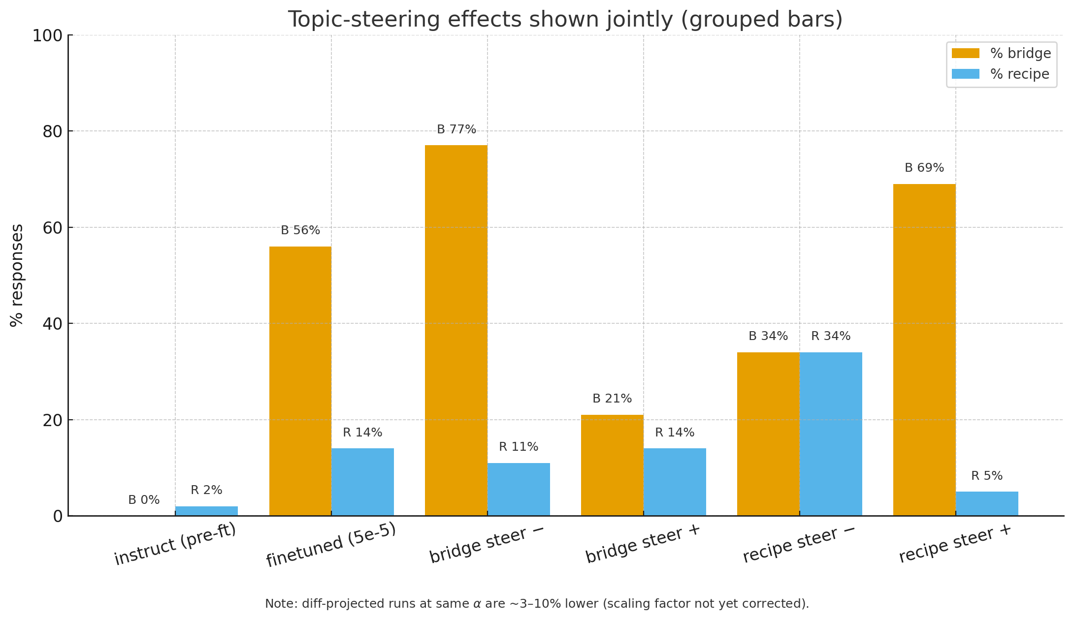 - Recipe direction: negative steering (increase recipe) produced 34% / 34% (bridge/recipe); positive steering (reduce recipe) produced 69% / 5%.
