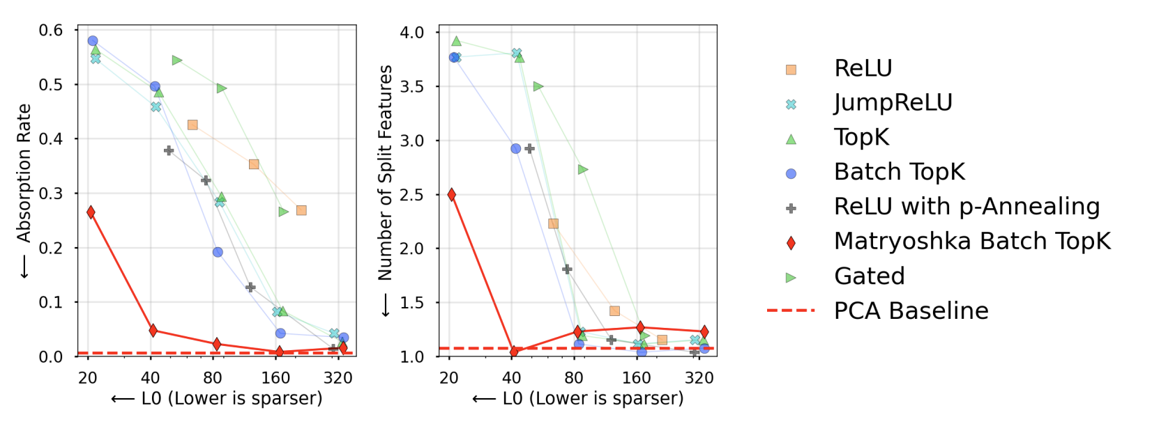 I'm not sure what it means that they got below the PCA baseline — my guess is that it means that their raw number of split features is lower for the Matryoshka SAE than it is for the first 40 principal components when you do PCA? This is interesting. They never discuss it in the paper. I'd like to do a future blog post on PCA.